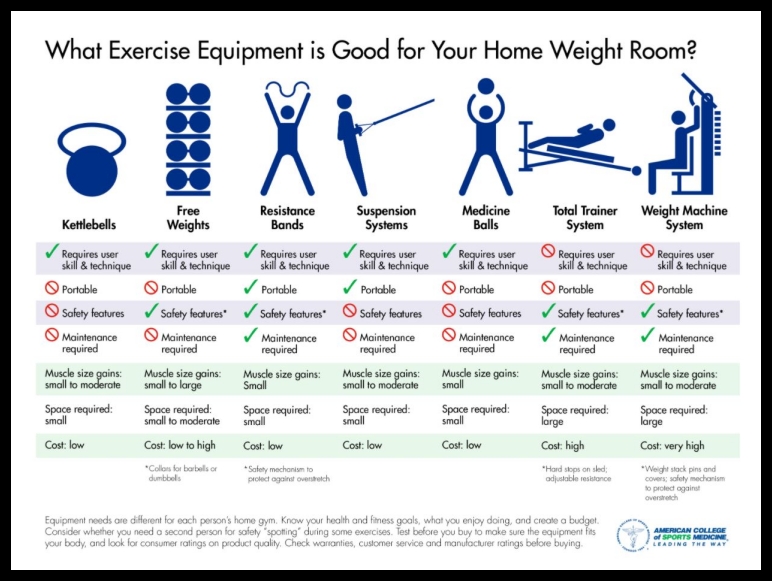 My home gym became my cornerstone during the COVID-19 Pandemic. I was fortunate to have the space to make it my very own that worked perfectly “for me, and my living situation.” It was even more important that it fit my budget. I knew that ultimatley this was an investment towards my health. As a health professional, it was very significant to make this my quarantine project. Yes, that meant being creative! I looked at my budget, space, and essential must haves for a home gym to make this work. There are three major components to achieving optimal fitness. Those three are cardiorespiratory fitness, resistance training, and flexibility training. As an ACSM Certified Fitness Professional, a great resource that breaks down how you can make your home gym successful comes directly from the ACSM.org page.
